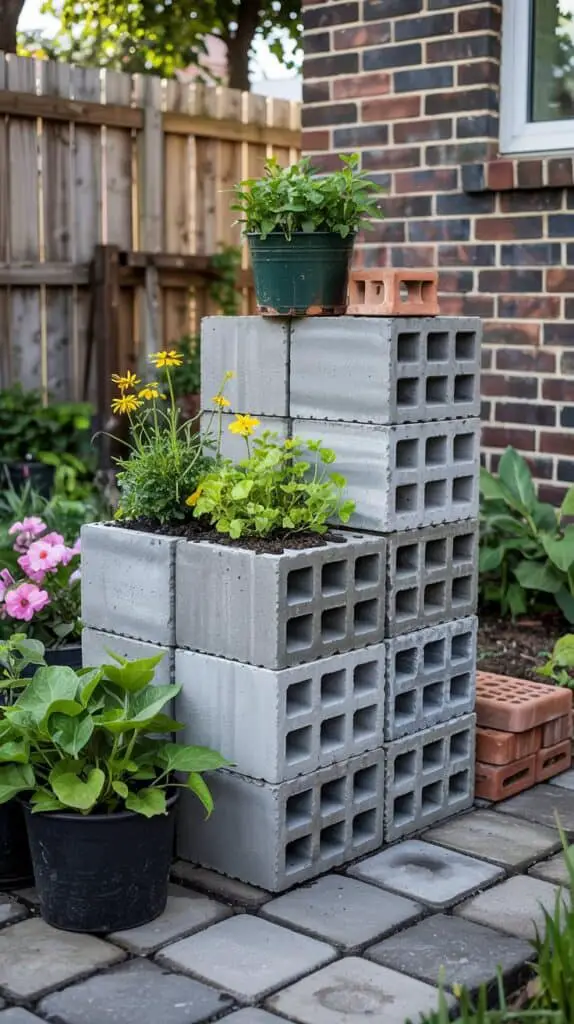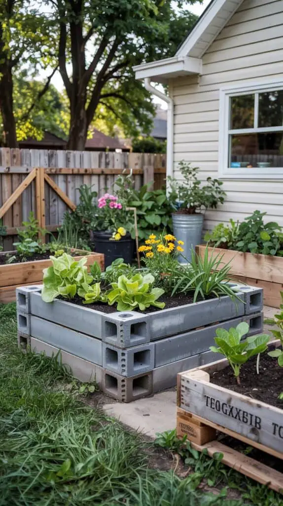 Concrete blocks are especially versatile for raised garden beds. They stack easily, don’t rot, and can be rearranged if you move. The holes in the blocks can even be planted with herbs or flowers, adding extra growing space without extra cost.