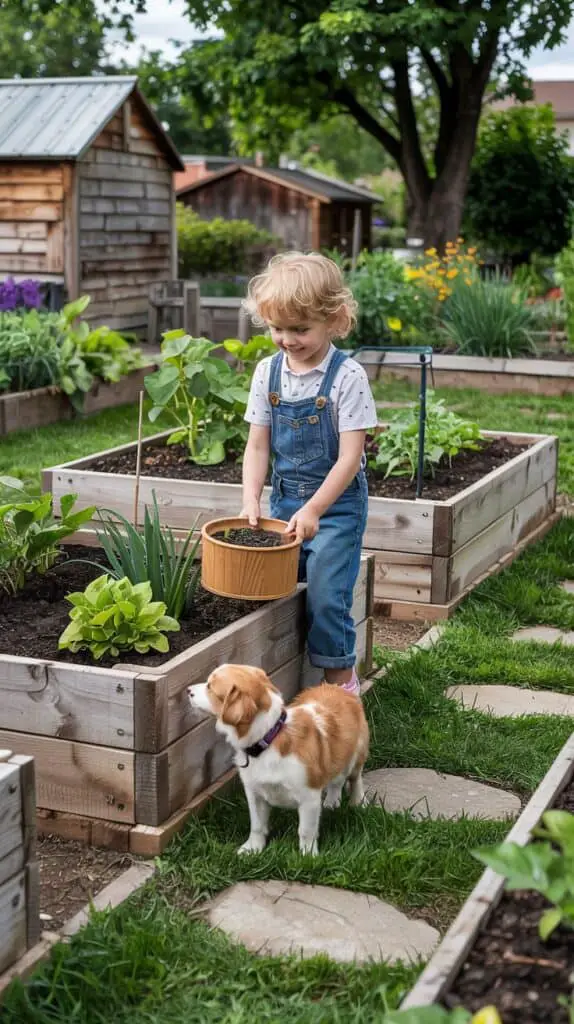 Low-profile raised garden beds work well for children who want to help with planting and watering. They also reduce the temptation for pets to climb inside, especially when paired with clear boundaries like mulch or stepping stones around the beds.