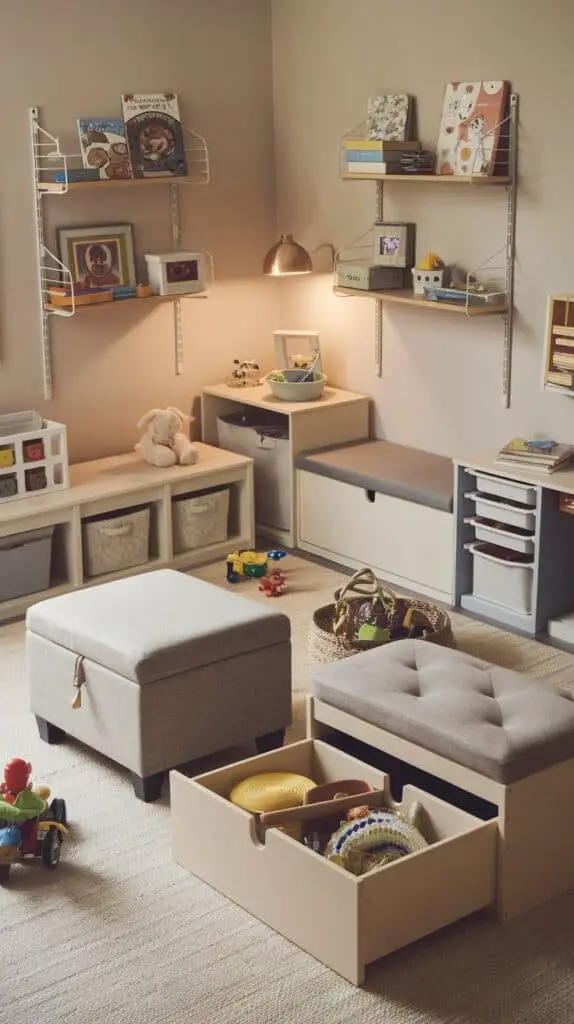 If there’s one secret to a functional playroom, it’s hidden storage. Ottomans, benches, and side tables with compartments are your best friends. Even a simple toy chest can double as a reading bench or coffee table with a soft cushion on top.