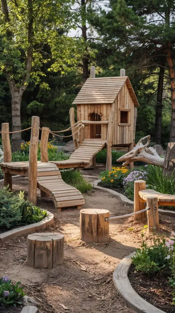 Here are some simple, creative, nature-inspired wooden playground ideas that fit small gardens, larger family backyards, raised bed spaces, and DIY setups. Think rustic charm, forest vibes, and lots of open-ended play.