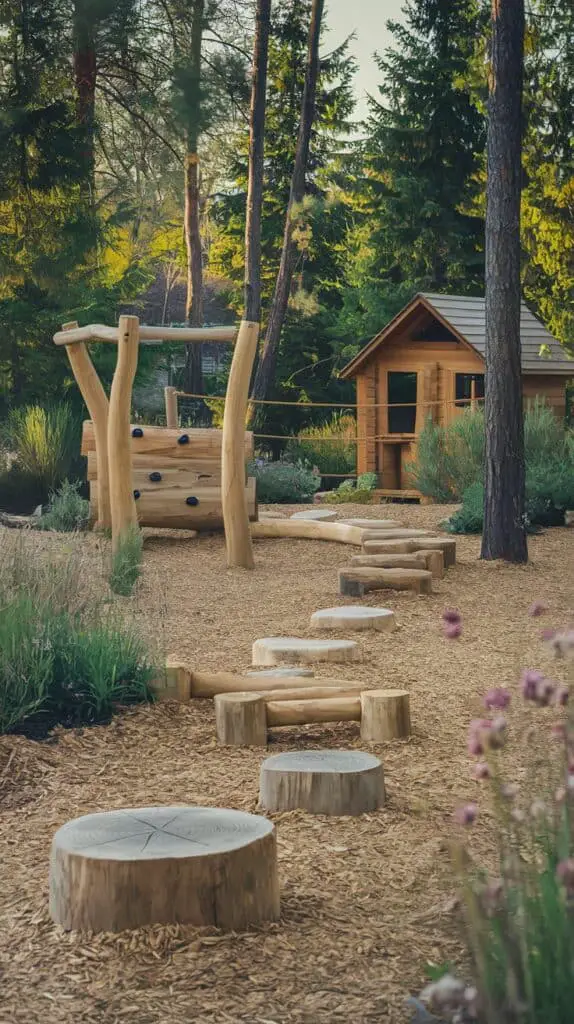 The goal is to create a children’s playground that supports outdoor learning, balance, and confidence without relying on plastic pieces. Surround the structure with mulch or wood chips for safety and to maintain a natural, forest-style look.