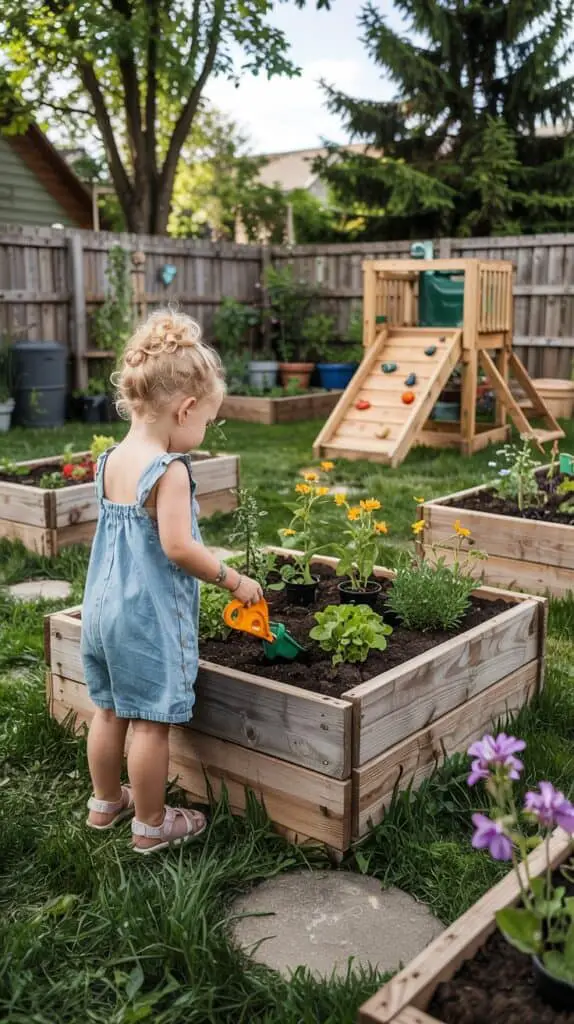 You can build small kid-height planters for vegetables, wildflowers, or sensory plants. The mix of play and gardening turns your backyard into a mini outdoor classroom — perfect for slow afternoons, family activities, or outdoor learning spaces inspired by Waldorf and Reggio Emilia principles.