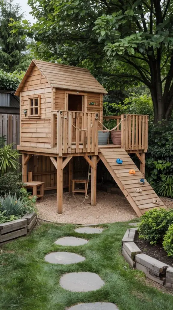For uneven or sloped backyards, a raised wooden play platform can be a game-changer. Build a small deck for climbing, sliding, pretend play, or even family picnics. Add a rope railing or a little lookout window to spark imagination. Surround it with shrubs, shade plants, or simple stepping paths and you instantly have a charming woodland retreat right at home. This is also perfect for families who want a long-lasting structure that ages beautifully with the garden.