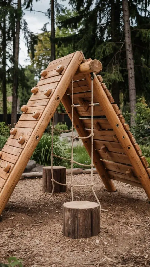 Instead of installing a single big climbing wall, consider building a small wooden climbing area made from sturdy branches or timber frames. Think climbing stumps, a mini scramble hill, or a simple wooden triangle structure kids can climb over and under.