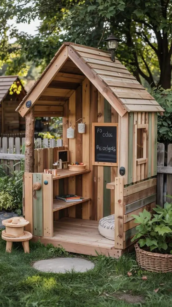 Kids can transform it into anything — a bakery, a castle, a forest cabin, a reading nook. Decorate with lantern-style solar lights, outdoor cushions, or a chalkboard wall. This blends beautifully into natural outdoor playground designs and works for any backyard size.