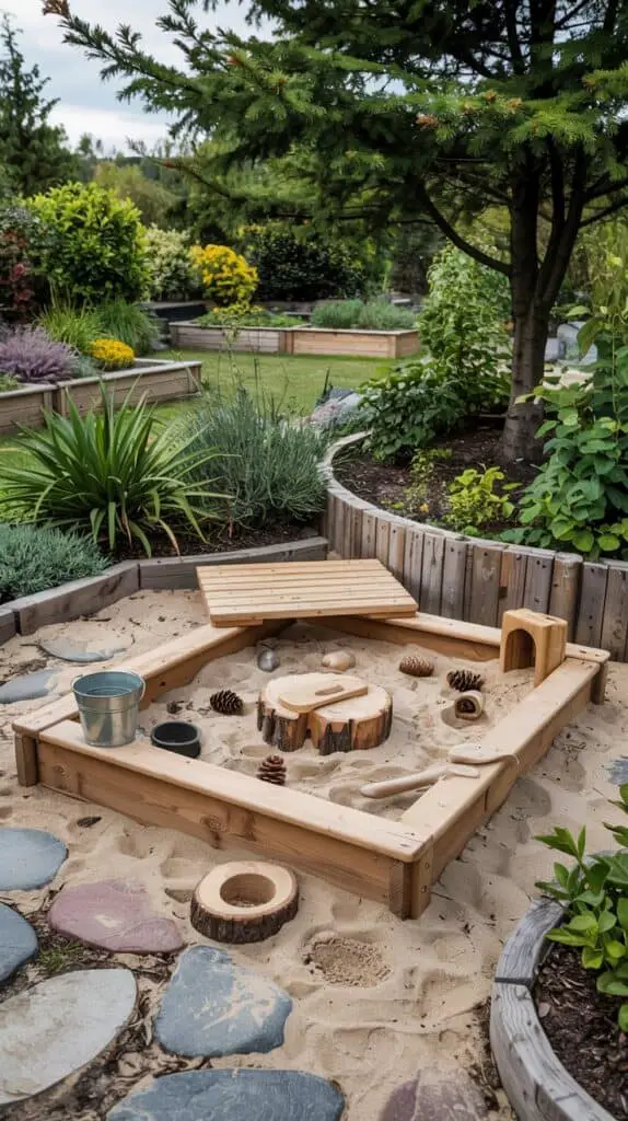 A wooden sandbox surrounded by plants, shrubs, and maybe a small log border creates a magical natural play zone. Choose untreated or child-safe lumber, add river stones, pinecones, buckets, and metal scoops for open-ended play.