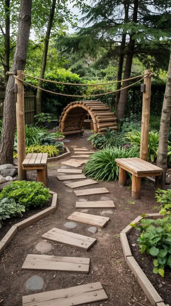Balance beams, log steps, and low obstacle paths made from cut logs or timber pieces are incredibly simple to build — and they last for years. Lay wooden rounds in a winding pattern to create a playful path across the garden, or build a narrow balancing beam supported on short posts.