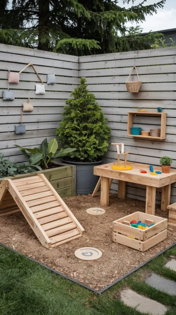 If your space is tiny, build a small toddler-safe corner play zone. A wooden climbing ramp, a mini slide, a sensory table, and a wooden bin for nature treasures can fit in even the smallest gardens. Use soft mulch underfoot and add a raised planter or potted shrubs nearby to make it feel cozy and intentional. This design gives toddlers independence while staying safe within a small outdoor area.