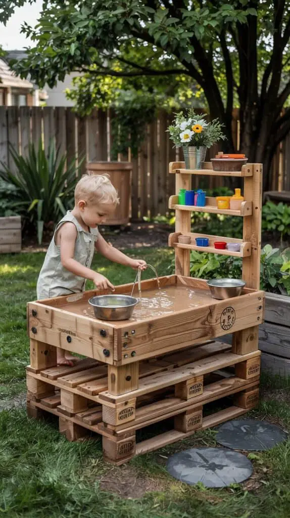 A wooden water table is sustainable, fun, and incredibly easy to maintain. Build one from old pallets or scrap lumber, add metal bowls or tubes for pouring, and let kids explore water play, mud kitchen fun, and experiments. Place it near a tree or in a shaded corner so the experience feels refreshing even on hot days. This natural play feature blends perfectly into backyard woodland designs.