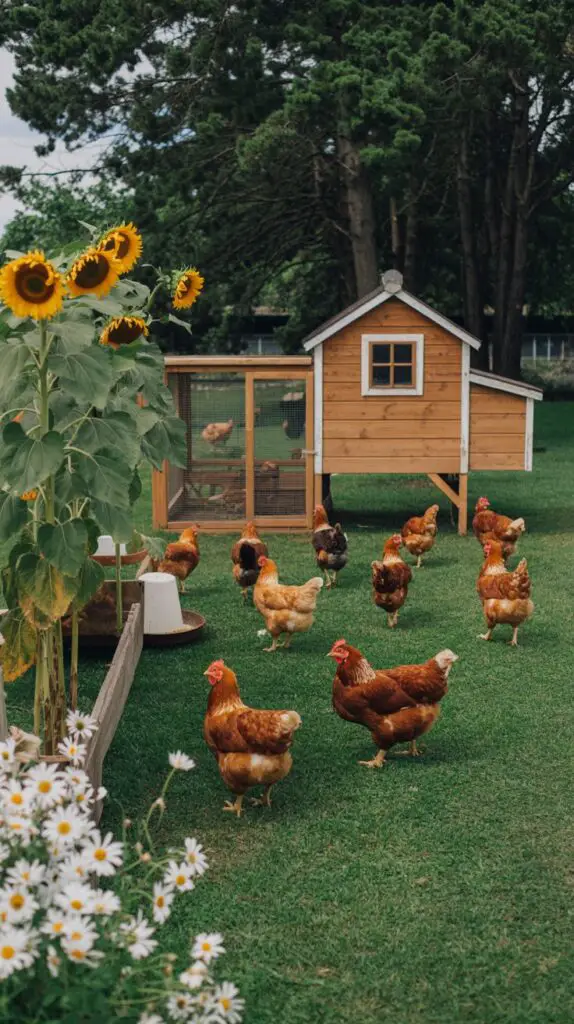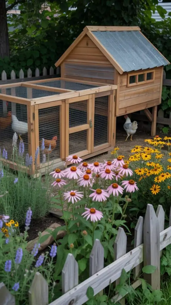 If you’re feeling extra, create a split-view fence—flowers on one side, chickens on the other, with a low bench in between. It becomes a quiet spot where kids or guests can sit and watch the flock. Almost like your own mini pet garden retreat.