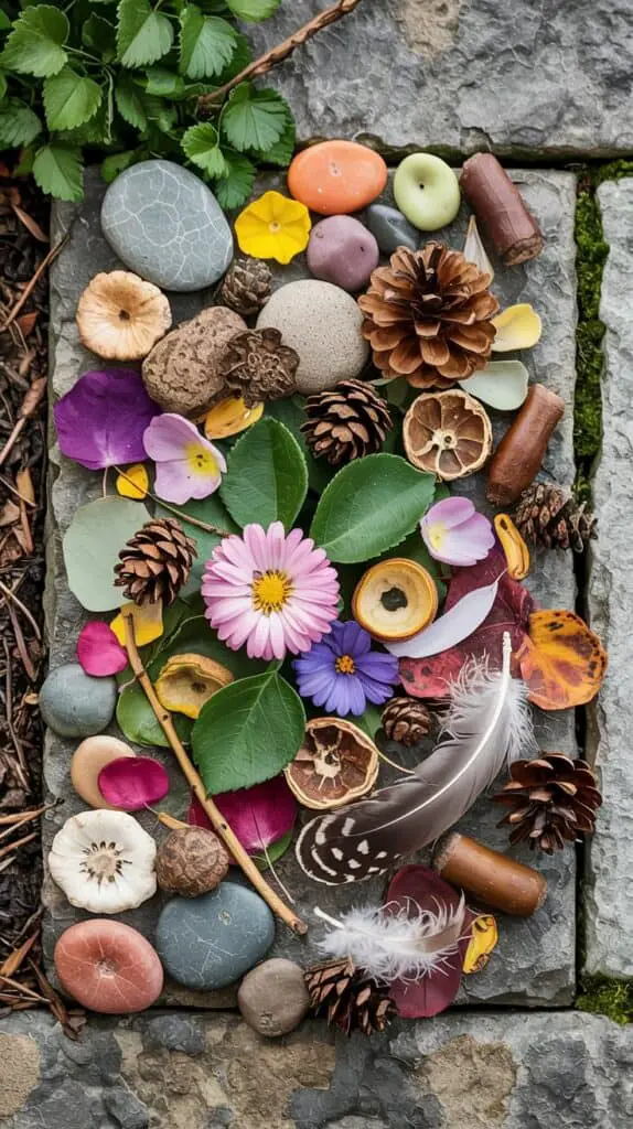 Start with a scavenger hunt! Let your kids explore the garden, park, or even the sidewalk edges to collect natural materials. Look for variety—round stones, twigs, leaves in different shapes, flower petals, pinecones, seeds, feathers, or even dried fruit peels. You’re aiming for texture and contrast. Avoid anything sharp or moldy, and try not to disturb any critters’ homes (no nicking moss off walls, please).