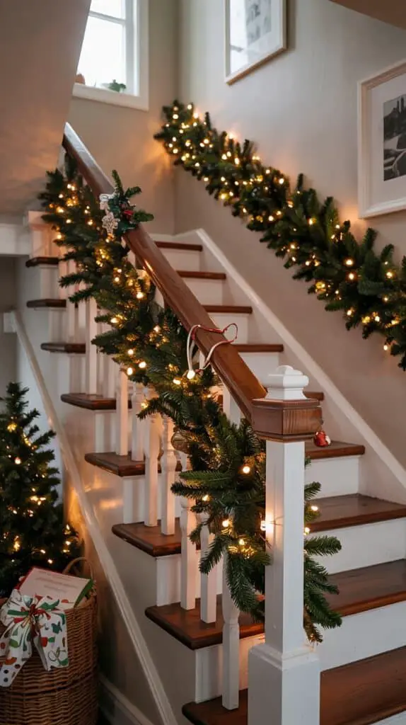 Nothing beats the glow of fairy lights winding through greenery. Whether you prefer white or multicolor, they instantly make your staircase feel festive. Wrap them gently around your garland, weaving in and out for an even glow.