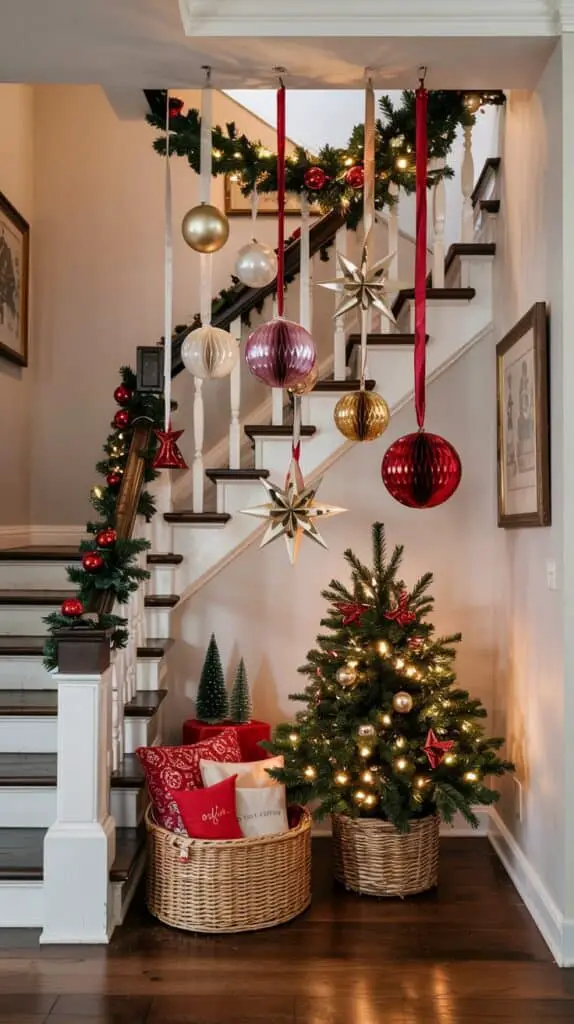 Instead of only wrapping your banister, use the space beneath it for extra decor. Hang a cluster of ornaments, bells, or paper stars on long ribbons from the upper railing. This draws the eye upward and adds movement to your staircase decor.