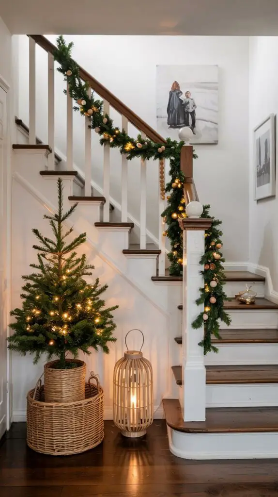 Add a small vase or lantern at the base of the stairs to ground the look, and maybe a subtle star ornament or two along the railing. This approach feels peaceful and uncluttered but still festive, perfect for homes that lean toward Scandinavian or minimalist design.