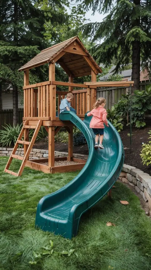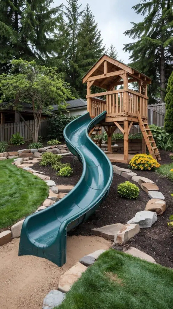 A hillside is literally begging for a slide, and you don’t need a full play tower to make it work. Install a long, durable slide right into the slope, add soft mulch or rubber chips at the bottom, and suddenly your yard has become the neighbourhood’s unofficial thrill ride.