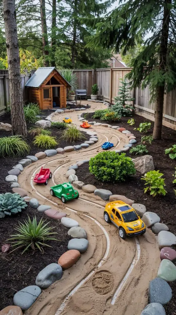 Use the curve of the hill to create a winding track made of sand, bark, or pea gravel. Add little river rocks as borders and let the kids race toy cars, run figurines, or even use it as a sensory play space.