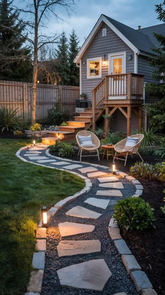 Use warm solar stake lights, string lights along the edges, or small lanterns to softly outline pathways. It makes the yard safer and more magical — like a mini outdoor adventure zone.