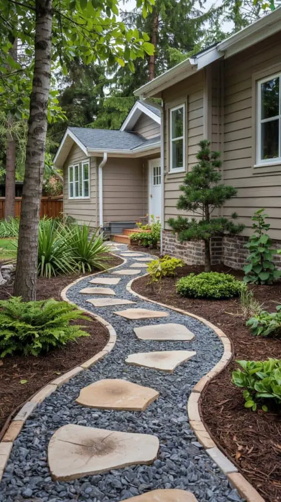 Stepping stones are the easiest way to give a side yard instant structure. Choose wide, flat stones with smooth edges — safe for kids running around barefoot or in socks (which they absolutely should not be wearing outside, but somehow still do).