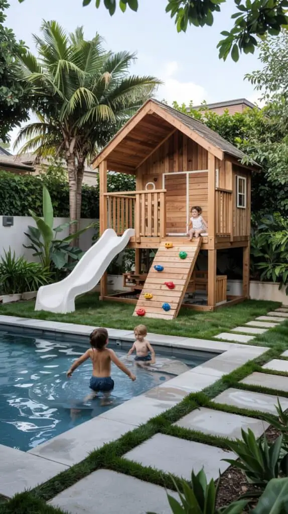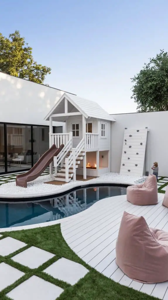 If your home has a pool—even a compact one—use the surrounding area as a multifunctional play space. A small climbing wall, a slide connected to a modern playhouse, or a toddler splash zone can fit beautifully alongside minimalist landscaping. Everything stays visually cohesive and still delivers hours of fun.