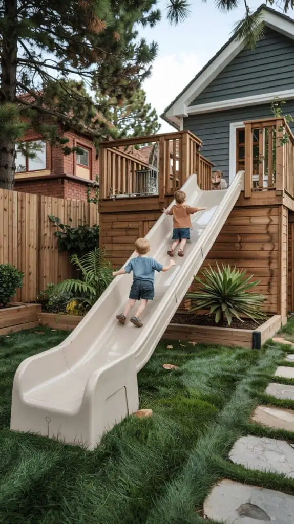 Slides don’t need their own footprint—wall-mounted or slope-friendly slides save space and look ultra clean. For modern yards, choose muted colors like charcoal, tan, or white. Kids get all the fun, and adults get a sleek, unobtrusive play feature.