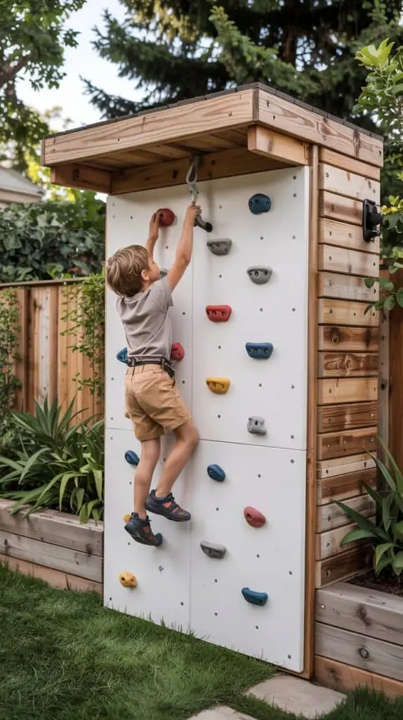 A small backyard becomes far more engaging when you add a mini climbing wall. Keep the wall neutral—white board, gray holds, or natural wood—and it becomes both a play feature and a modern art piece. It’s a huge hit for active kids without overwhelming the space.