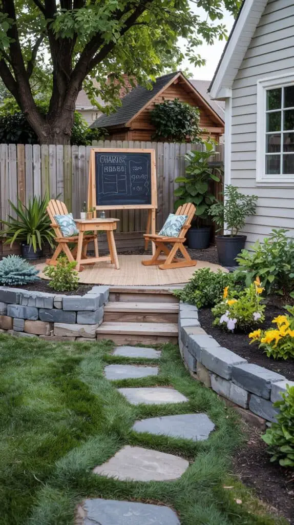 If your yard has a slight slope, work with it. Create two or three simple levels using small retaining walls, each with a purpose: a chalkboard zone, a crafts corner, or a lookout platform. The separation makes the yard feel larger and more versatile without adding clutter.