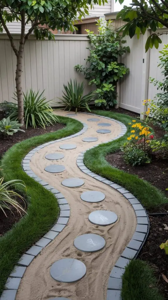 A tiny looped pathway made from stone, sand, or turf adds quiet entertainment without taking up much room. Curves make the space feel softer and modern, and kids will use it over and over for bikes, cars, and imaginative play.