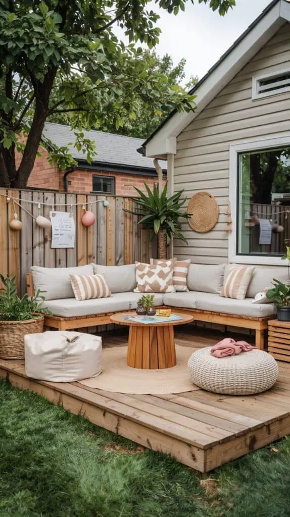 A cozy deck nook with outdoor cushions, bean bags, or a small table instantly gives kids a place to read, draw, or relax. When styled with soft neutrals and warm wood, this area blends effortlessly into a modern backyard layout.