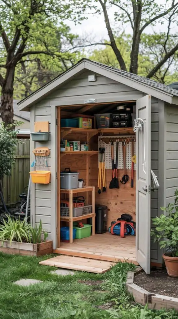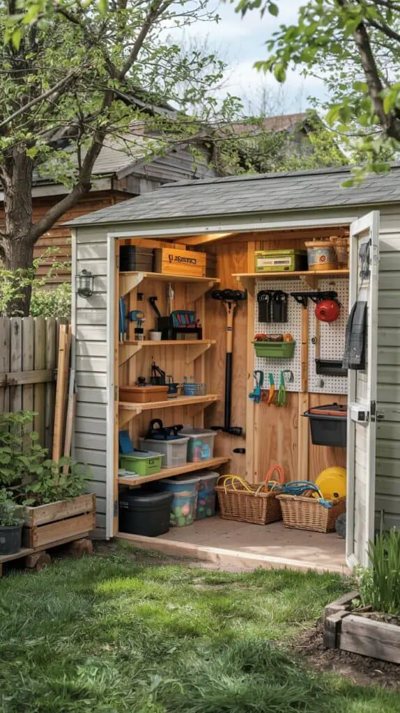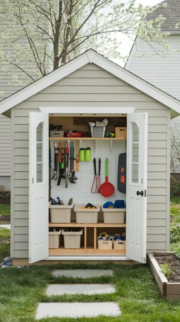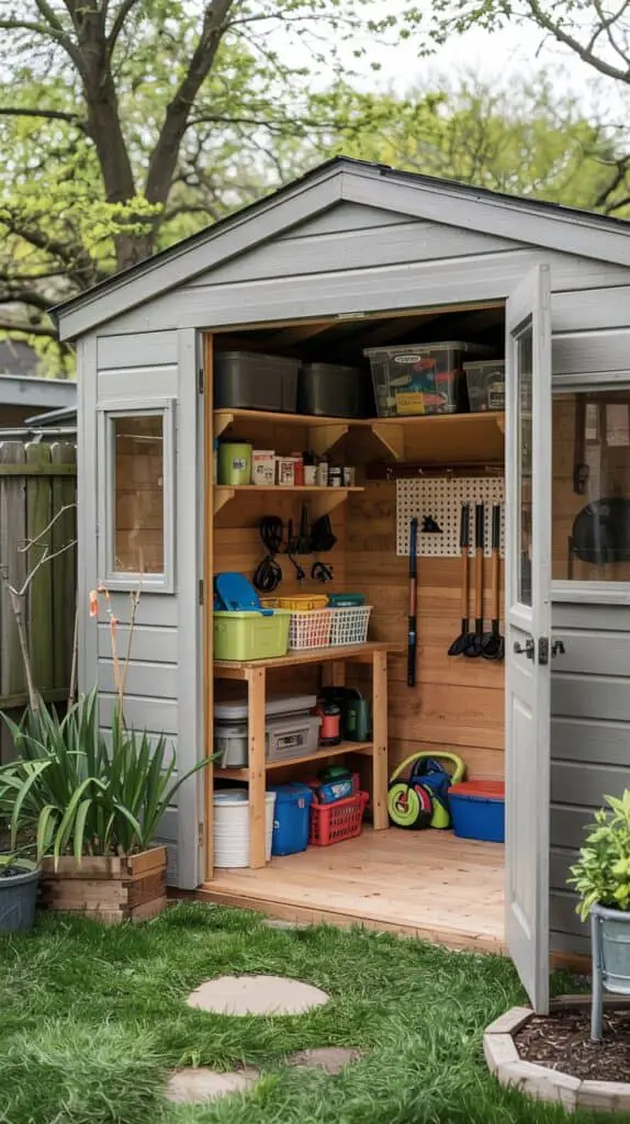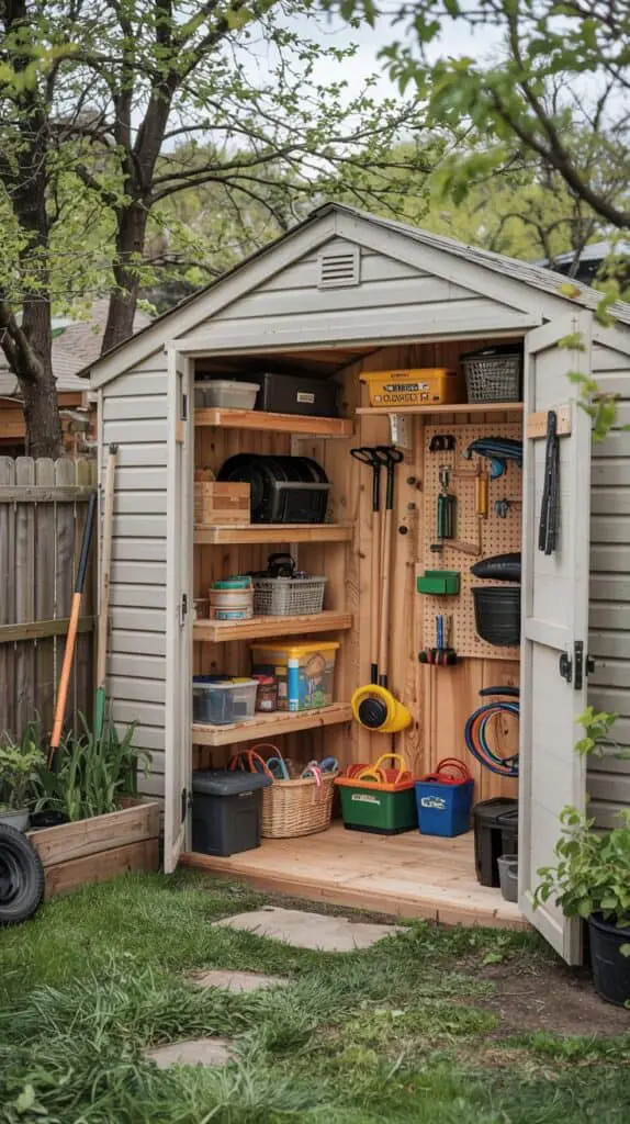 Stick to a limited color palette, avoid mixing too many container styles, and prioritize function over perfection. A shed that looks good but works poorly won’t stay organized for long.